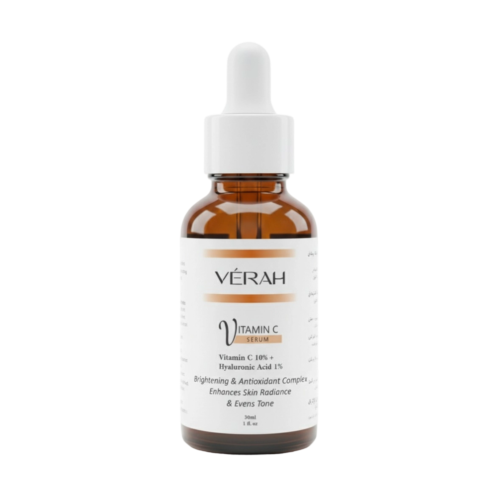 سيروم فيتامين C بتركيز 10% يتميز بتركيبة خفيفة وسريعة الامتصاص تساعد على تقليل مظهر البقع الداكنة وتوحيد لون البشرة والتخفيف من العلامات المبكرة للتقدّم في العمر. يحتوي على مغنيسيوم أسكوربيل فوسفات، وهو شكل مستقر ولطيف من فيتامين C يعمل على تفتيح البشرة الباهتة وحمايتها من العوامل البيئية الضارة. يمنح حمض الهيالورونيك ترطيبًا عميقًا وطويلًا، بينما يوفر فيتامين E وخلاصة الشاي الأخضر حماية قوية مضادة للأكسدة ضد الجذور الحرة. كما تساهم إضافة حمض الترانيكساميك وفيتامين B5 في تهدئة البشرة وتغذيتها وتعزيز قوة حاجزها، لتصبح أكثر نعومة، مرونة، وإشراقًا.